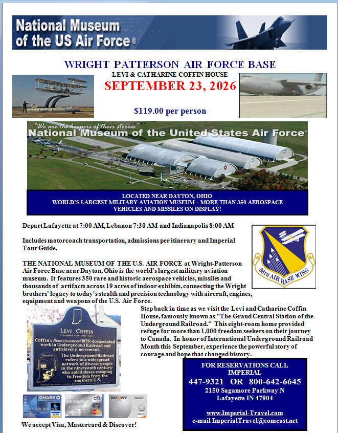 WRIGHT PATTERSON AIR FORCE BASE & LEVI COFFIN HOUSE – SEPTEMBER 23, 2026
